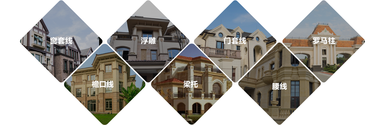 主要有羅馬柱、窗套、門套、花盆、檐口線條、腰線、山花、梁托、花瓶欄桿等多種造型,表面可涂刷各種外墻涂料。